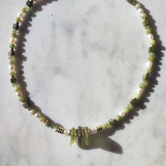 Le collier de perles Pear est une pièce unique composée de verre de mer, perles upcyclées et apprêts en acier inoxydable.
